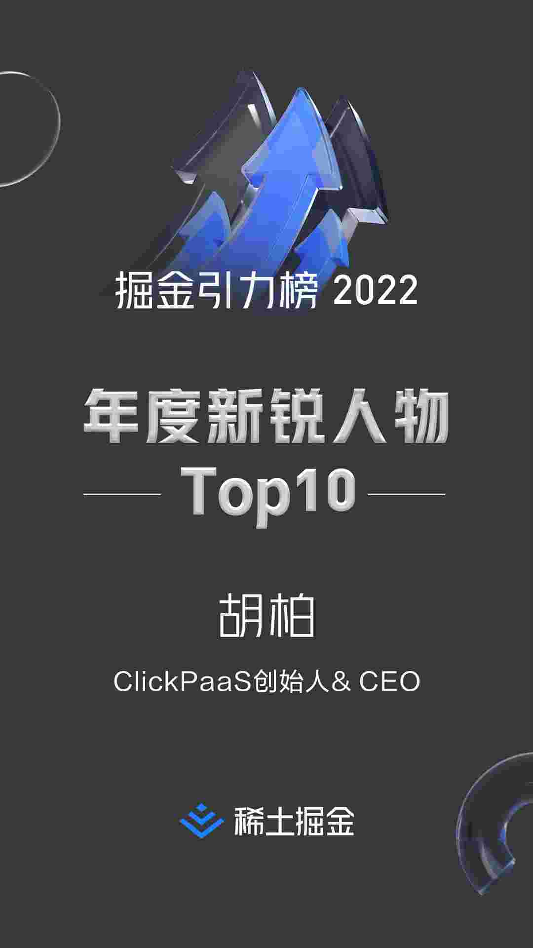 2022年1月6日,,稀土掘金社区第一届「掘金未来大会」成功举办,,,会上发布了“2022 稀土掘金引力榜 年度新锐人物”榜单,,上海爱湃斯科技有限公司(简称圆梦钱包)创始人及CEO胡柏实力入选年度新锐人物TOP 10。。。。